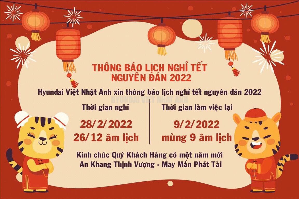 Hyundai Việt Nhật Anh xin thông báo đến Quý khách hàng lịch nghỉ Tết Nguyên Đán
